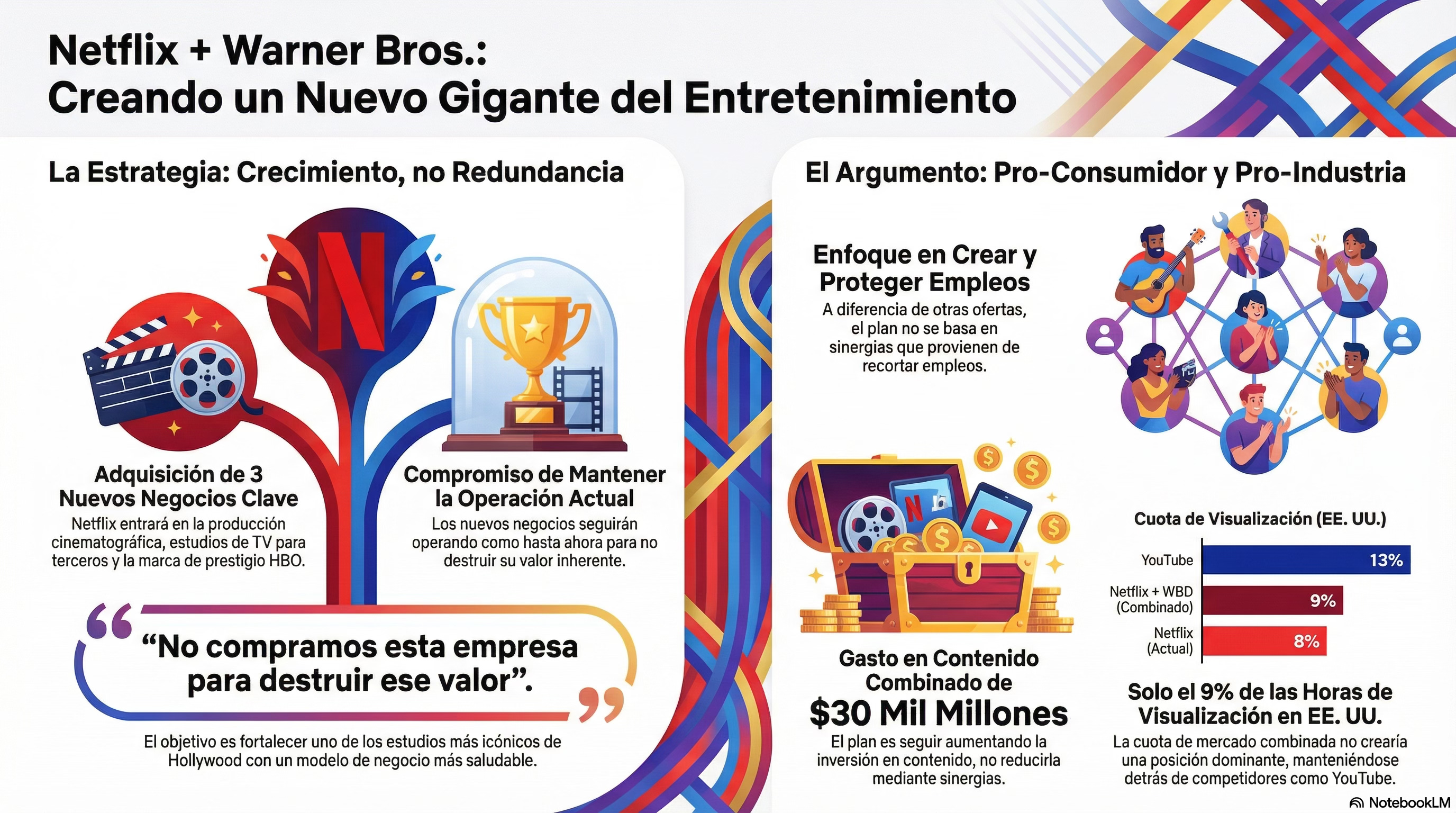 Netflix acaba de compartir una presentación en la que los co-CEOs de Netflix, Greg Peters y Ted Sarandos, desgranan la estrategia corporativa general en la compra de Warner Bros. Discovery. La adquisición se presenta como un movimiento transformador, aunque inesperado, diseñado para crear valor para accionistas y consumidores. La estrategia de integración se basa en un modelo de tres fases que prioriza el crecimiento orgánico continuo, la maximización del valor del catálogo y las marcas de Warner (especialmente HBO) a través de Netflix, y la futura explotación de la propiedad intelectual combinada. Estratégicamente, la adquisición añade tres nuevas líneas de negocio (estudio de cine, estudio de televisión para licencias y HBO) sin generar redundancias, con el compromiso de mantener sus operaciones y liderazgo actuales.
